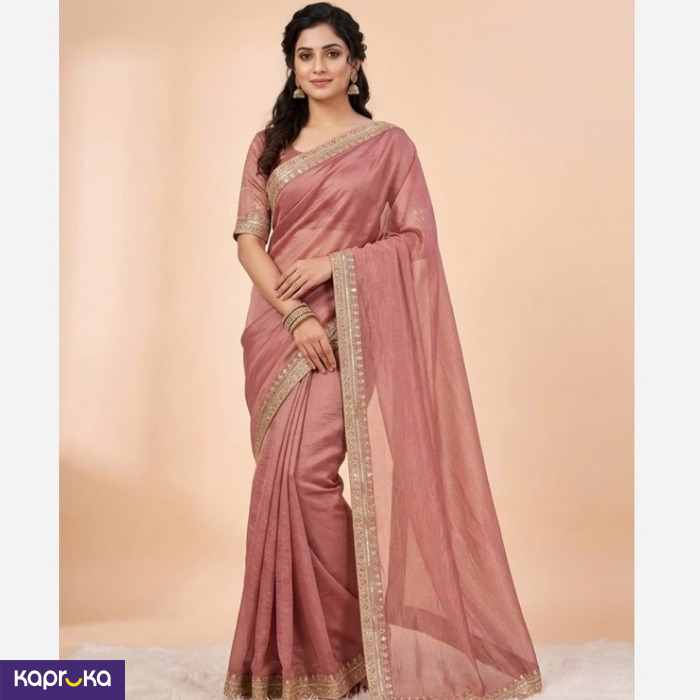 The sparkling beauty of this contemporary saree lies in the intricate handcrafted embellishments running across the drape