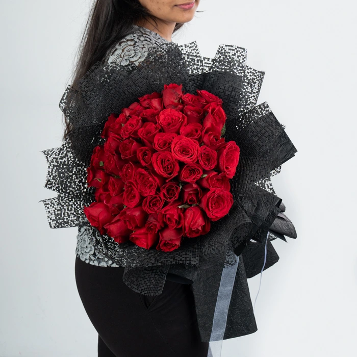 Express your deepest feelings with the Fifty Shades Of Red Bouquet, featuring fifty stunning red roses. Each rose in this bouquet speaks of love, passion, and devotion. It`s beautifully wrapped in elegant paper and tied with a graceful ribbon, making it a perfect gift for someone special.