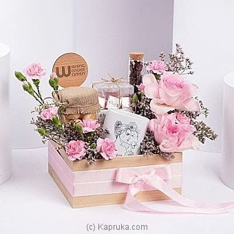 `Arranged Beautifully in a Box ,3 Light Pink Spray Carnation 2 Light Pink Roses 2 Stem Purple Limonium 1 Wooden tag 150 Grams Vanilla Cookies in a Jar 140 Grams Chocolates in a Box Hibiscus Tea in a Test Tube 1 Printed White Mug`