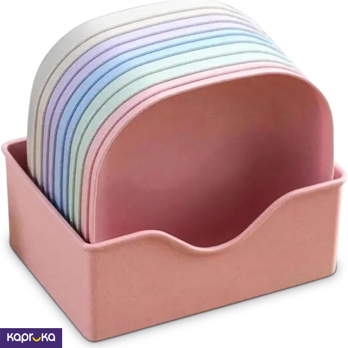 • 2. WHAT`S INCLUDED: The set includes 10 vibrant breakfast plates (15 x 15 cm) with a handy stand. Crafted from unbreakable virgin plastic, these plates are microwave-safe and perfect for daily dining.