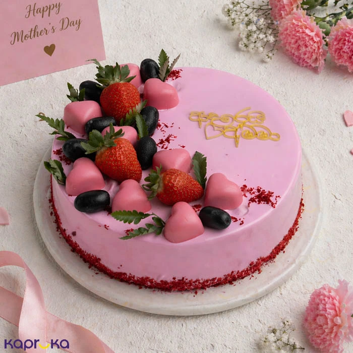 A soft and fluffy vanilla sponge cake layered with light whipping cream and soaked in delicate gateaux syrup for extra moisture and flavor. Finished with a smooth pink glaze and a heartfelt `Adarei Amma` tag, this elegant creation is a sweet tribute to a mother`s love perfect for celebrating Mother`s Day with warmth and affection. Ingredients : Gatuex syrup, whipping cream, chocolate sponge