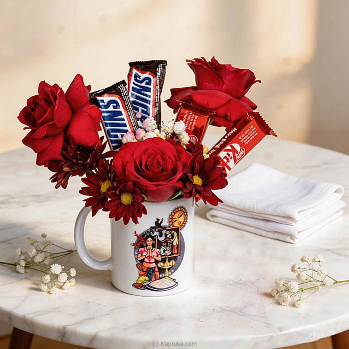 Celebrate the Sinhala and Tamil New Year with this unique and charming gift mug filled with delightful treats. Beautifully arranged with fresh red roses and premium chocolates, this festive mug brings together tradition, sweetness, and elegance in one perfect gift.