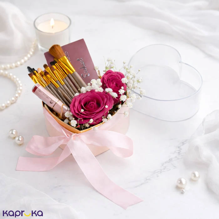 Stylish beauty collection paired with lovely pink roses. The set includes a matte lipstick, eye shadow palette, mini make up brushes, and a pink heart flower box arrangement.