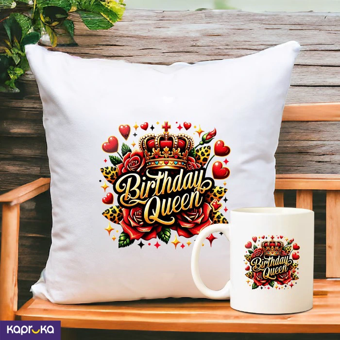 The set includes a decorative pillow and a matching mug, both themed with the `Birthday Queen` design.