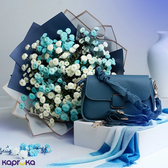 Discover the Blue Dream Elegance Gift Set, a charming Flower and Fashion combination perfect for special moments. This set showcases a beautiful Blue Dream Button Flower Bouquet and a stylish Lunara Twist Strap Handbag in Blue. Whether it`s a birthday, anniversary, or a meaningful occasion, this lovely pair adds an elegant touch.