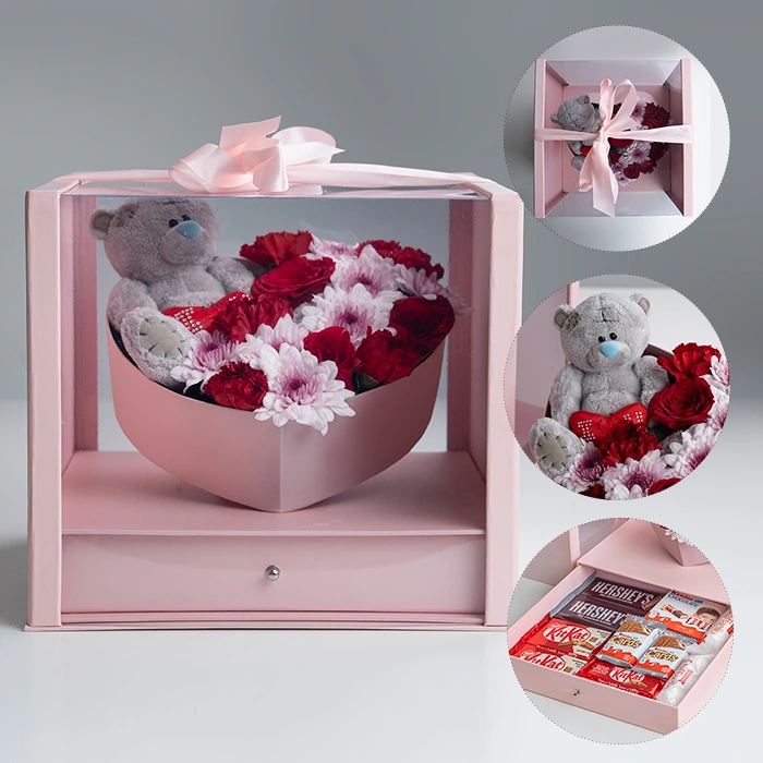 The combo includes a plush pink Teddy bear, a bouquet of flowers, and a selection of chocolates.