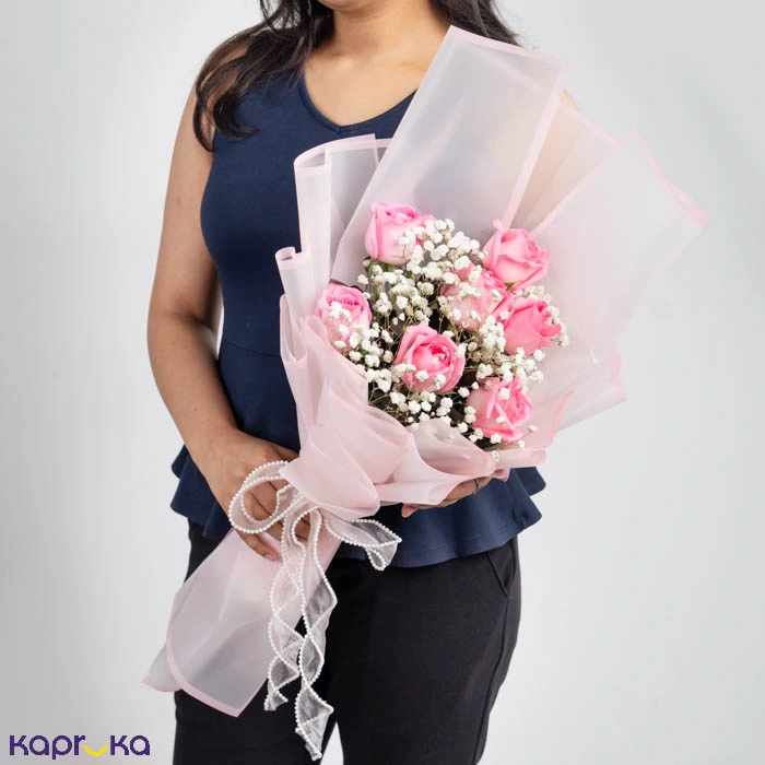 The `Blushing 7 Pink Roses Bouquet` is a perfect expression of love and thoughtfulness for any occasion. This stunning bouquet, featuring fresh pink roses and delicate babyâ``s breath, is beautifully arranged and wrapped with elegance. Ideal for birthdays, anniversaries, or Valentineâ``s Day, this floral arrangement brings warmth and cheer to everyone in Sri Lanka.