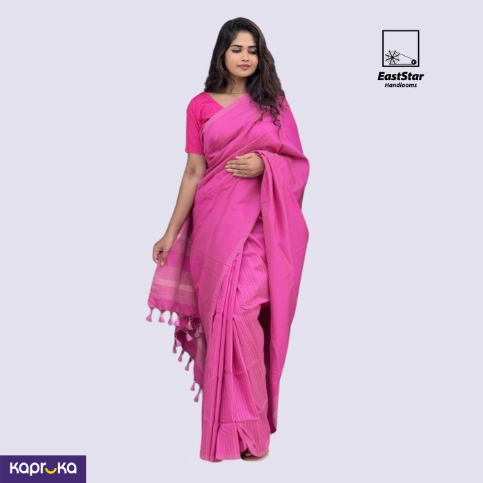 Illuminate your wardrobe with the vibrant elegance of the EastStar Handlooms Bright Pink Saree. This exquisitely crafted saree features light pink horizontal stripes and delicate tassels, making it a perfect blend of tradition and contemporary style. The matching blouse complements the saree beautifully, enhancing the overall allure. Ideal for festive occasions or special gatherings, this saree showcases the meticulous craftsmanship of EastStar Handlooms. Embrace the charm and sophistication of this stunning attire. Order now to add a touch of grace to your ensemble.