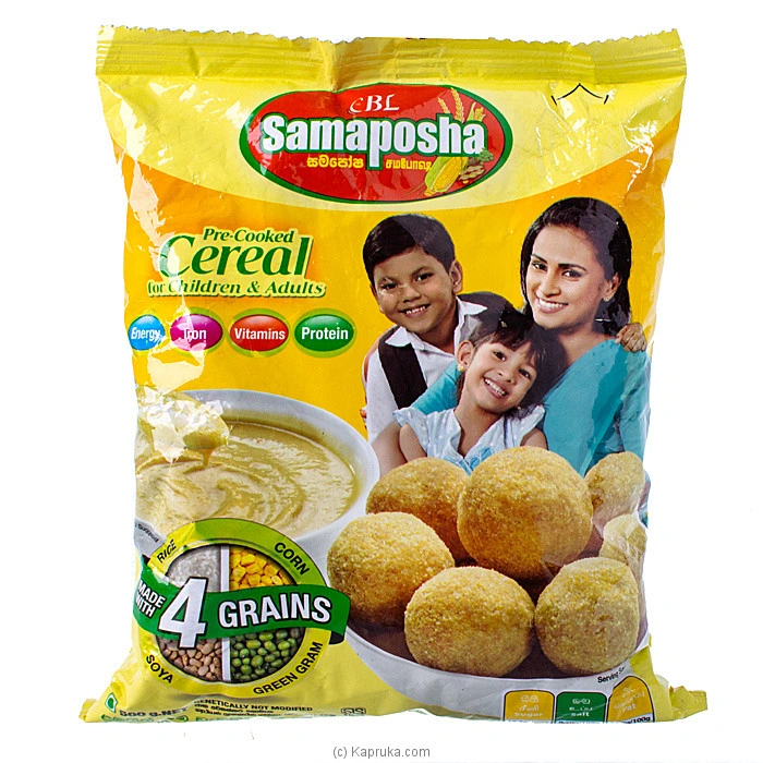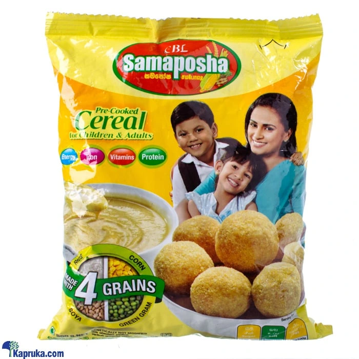 • Samaposha is manufactured in Sri Lanka to international standards using nutritious local grains comprising corn, soya, green gram and rice. Samaposha is SLS certified per-cooked cereal based nutritious supplement which serves the nutritional requirement of children. Samaposha is the perfect choice as a breakfast cereal that ensures children to be active throughout the day.