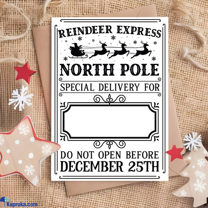 Bring joy to your holiday season with this charming Reindeer Express Christmas card. Available at Kapruka in Sri Lanka, this card adds a festive touch to your celebrations with its delightful North Pole design, including Santa’s sleigh and reindeer.