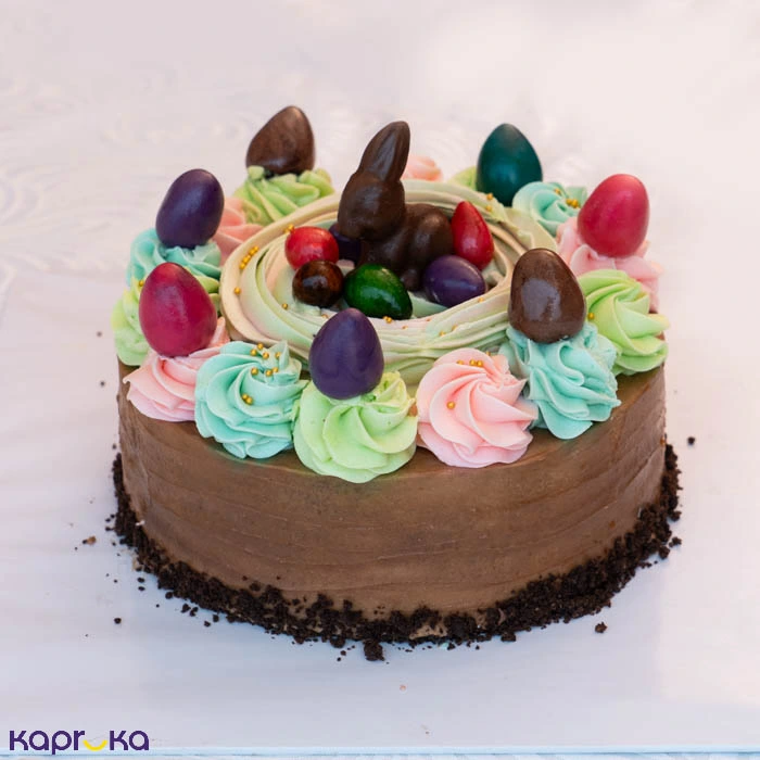 Celebrate the season with our delightful chocolate cake, topped with colorful icing, festive eggs, and an adorable chocolate bunny. Perfect for sharing with family and friends, this cake adds a cheerful and playful touch to your festive celebrations.