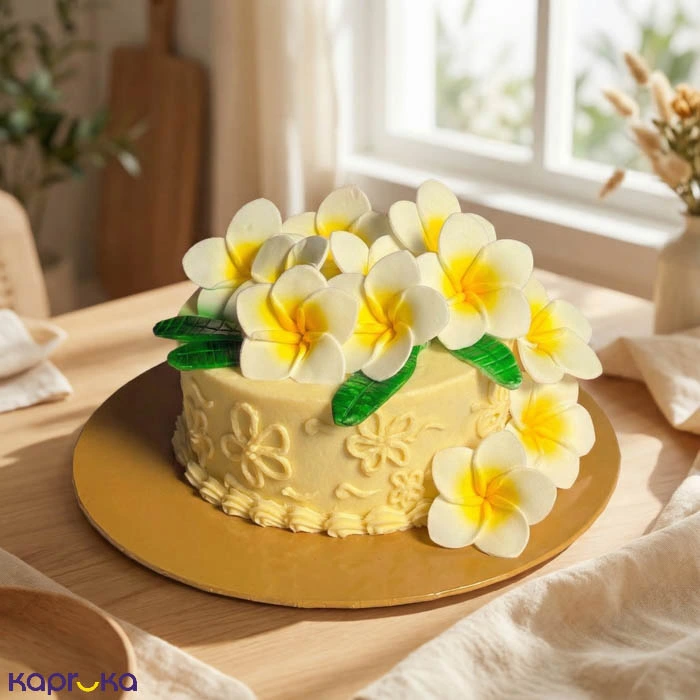 A graceful vanilla cake crafted with a soft, fluffy sponge and delicately finished with smooth icing. Elegantly adorned with handcrafted fondant Araliya flowers, this cake captures a sense of natural beauty and timeless charm. Each detail is thoughtfully designed to create a serene and sophisticated look, making it perfect for celebrations that call for a touch of elegance and refinement.