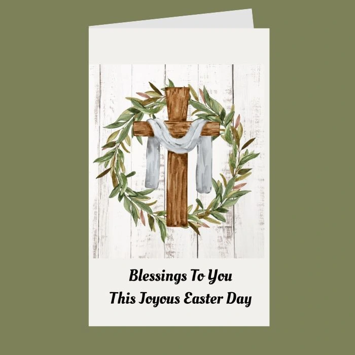 Share the joy of Easter with this beautifully designed card featuring a rustic wooden cross adorned with a flowing white cloth, symbolizing Christ`s resurrection. Encircled by a wreath of greenery, this elegant and faith-filled design is set against a soft wooden background, evoking peace and renewal. The heartfelt message, `Blessings to You This Joyous Easter Day,` makes this card a perfect way to spread love, faith, and hope to friends and family during this sacred season.