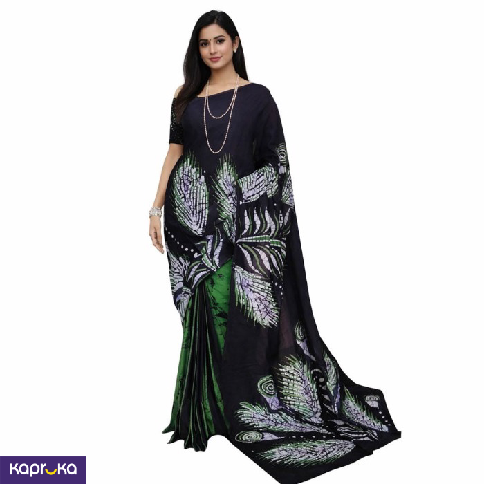 • The rich navy blue base enhances the vibrant emerald green pleats, creating a graceful contrast that makes the design stand out. The pallu showcases detailed batik leaf motifs with fine artistic strokes and dotted accents, giving the saree a unique handcrafted appeal.