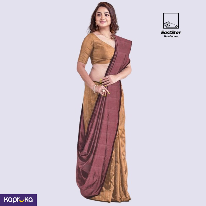 The Saree is made from handloom silk, offering a blend of traditional craftsmanship and elegance.
