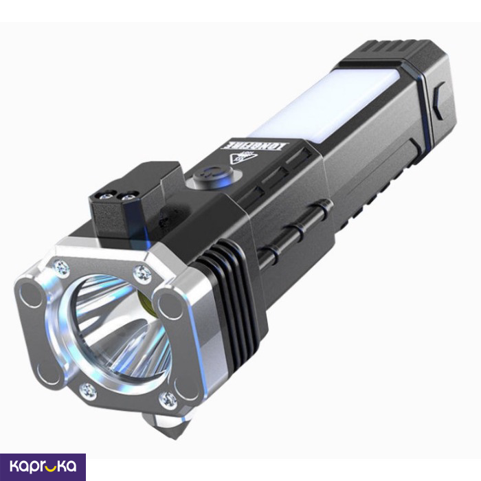 The Left Side Of The Flashlight Is Equipped With A High Harden Alloy Safety Hammer The Right Side Of The Head Is Equipped With A Knife. It Can Be Used To See In An Emergency. Four Lighting Modes Below-