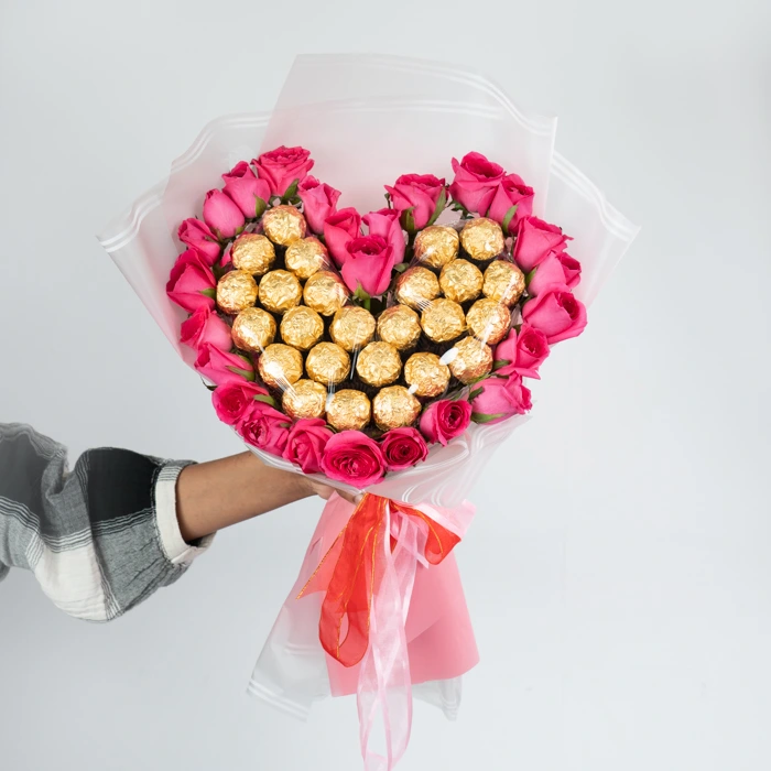The Golden Rose Heart Bouquet with Pink Roses and 25 Chocolates is a lovely gift from Kapruka, perfect for special moments. This choco gift combines delicious treats with beautiful flowers, making it an ideal choice for birthdays, graduations, or other milestones in Sri Lanka.