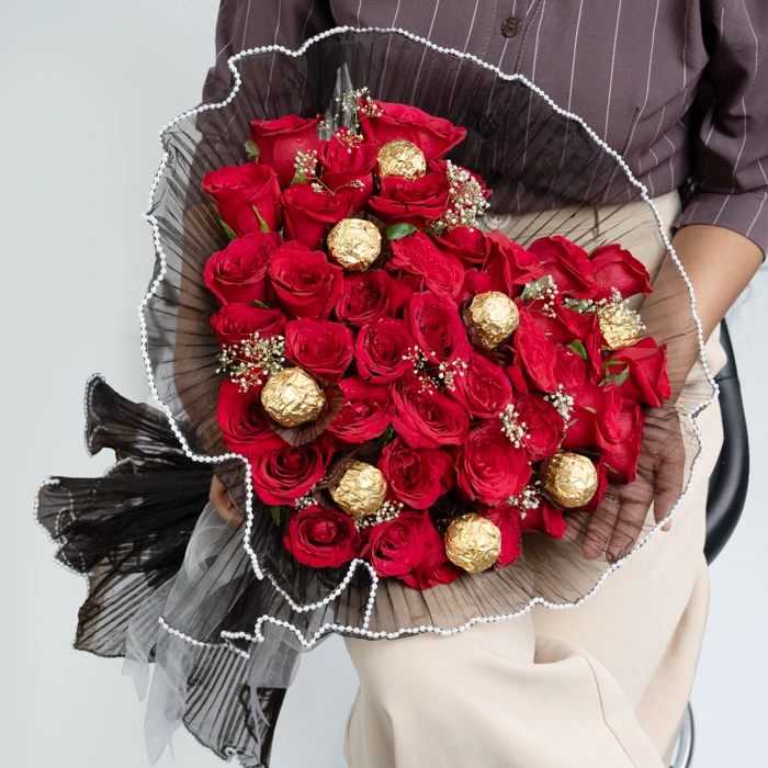 The Golden Vows Bouquet with 50 Red Roses and Kapruka Chocolates is more than just flowers. It`s a beautiful gift of love, wrapped in soft petals and sweet treats.