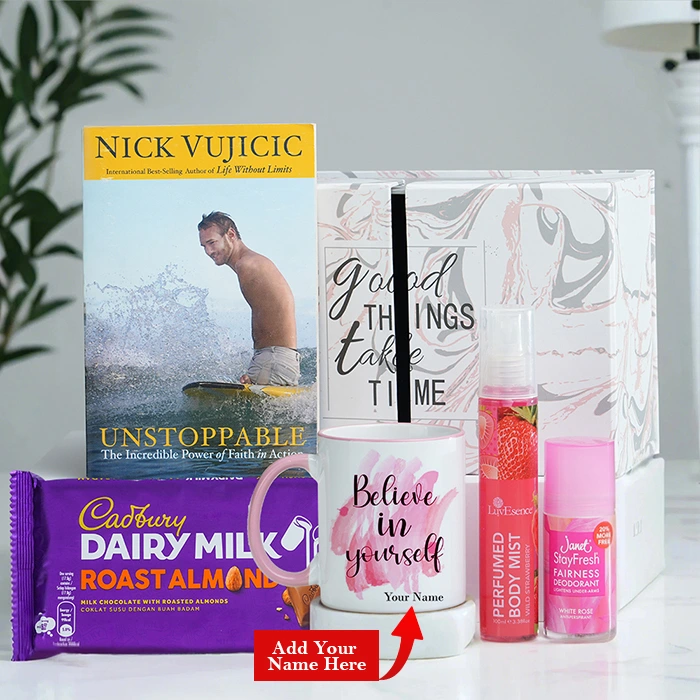 Celebrate her strength, sweetness, and sparkle with our ``GOOD THINGS TAKE TIME`` Personalized Inspirational Gift Set. This charming gift set is filled with comfort, encouragement, and delightful treats, perfect for reminding her how amazing she is.