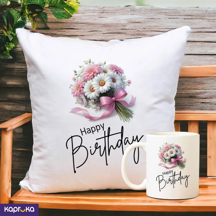 The set includes a decorative pillow and a matching mug, both themed with a `Happy Birthday` design.