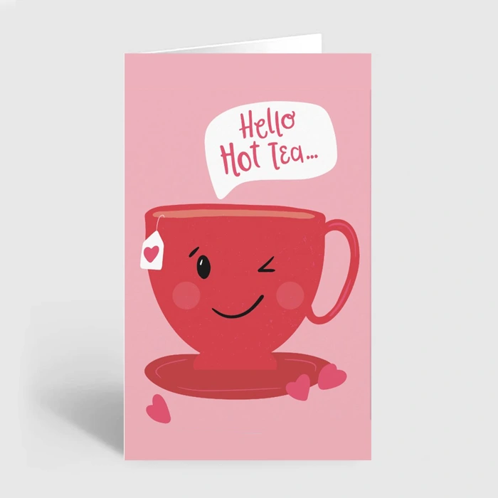 Celebrate special moments with the `Hello Hot Tea Love Greeting Card,` perfect for tea lovers this Valentine`s Day. This playful card invites your friends to enjoy a chat over a warm cup of tea.