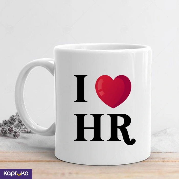 The `I Love HR` mug is crafted from high-quality ceramic material, ensuring durability and a smooth finish.