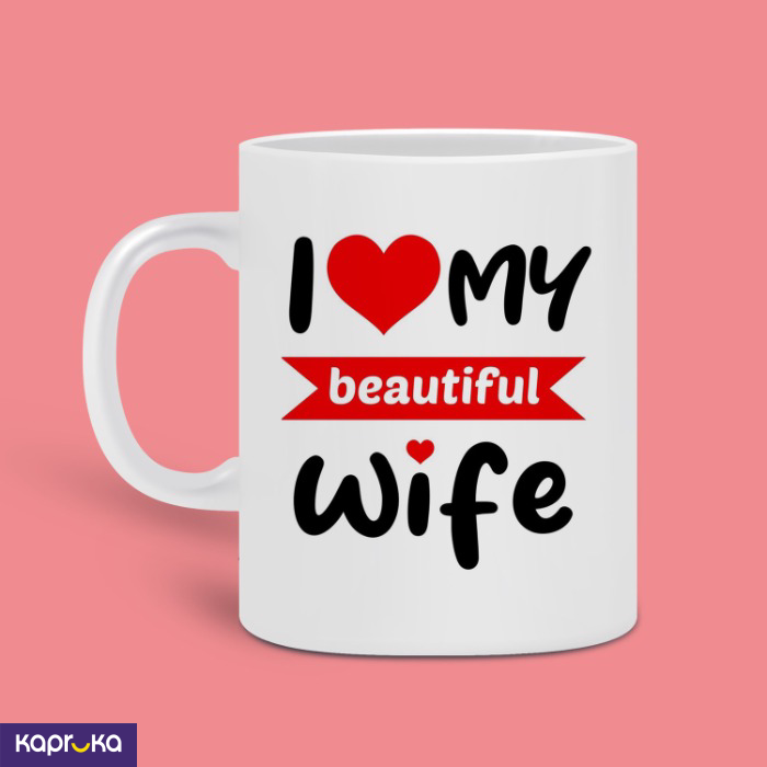 Currently, the `I Love My Beautiful Wife` mug comes with the pre-printed message as shown. Personalization options are not available for this particular mug.