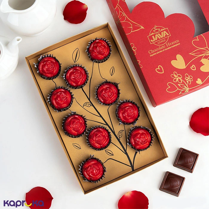 The Java Valentine Rose of My Heart package includes a beautifully arranged set of premium chocolates crafted to look like a bouquet, making it a perfect gift for Valentine`s Day or any special occasion.