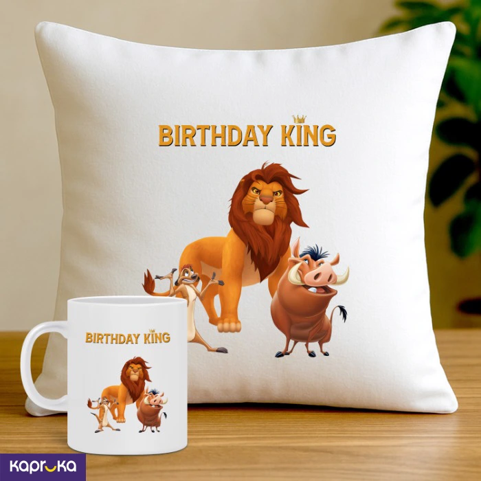 The set includes a themed Lion King mug and a matching pillow, both adorned with characters and designs from the Lion King movie.