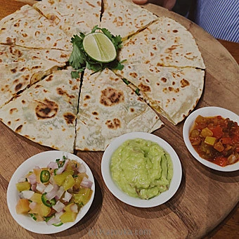 Your Choice OF grilled vegetables, Chicken or prawns with jack cheese, bell peppers and Mushroom Accompanied BY guacamole, Pico de gallo and Spicy salsa.
