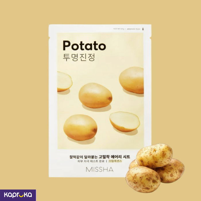 The Missha Airy Fit Sheet Mask Potato is a cream-type mask that uses potato extract to soothe, brighten, and moisturize the skin, making it ideal for sensitive, dull, or irritated complexions. The mask`s thin, natural fabric adheres closely to the skin to deliver deep nourishment with a blend of vitamins and minerals. Its benefits include improving skin texture, reducing redness, and leaving the skin feeling soft, radiant, and revitalized.