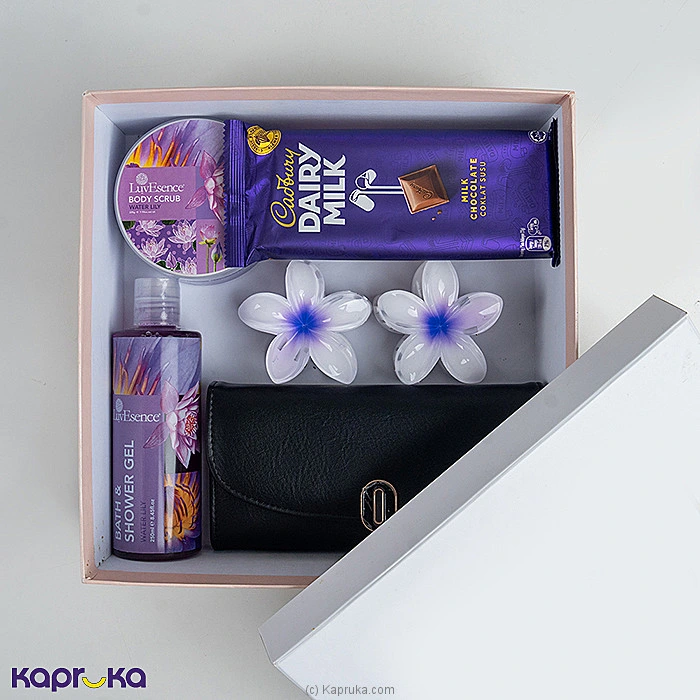 Celebrate your mom with this elegant and thoughtful Mother`s Day Purple Bliss Gift Set. Beautifully packed in a premium gift box, this charming set includes a stylish wallet, luxurious body scrub, refreshing shower gel, delicious chocolate, and decorative flower clip. A perfect combination of beauty, relaxation, and sweetness to make her feel truly special on her day. Ideal for gifting love and appreciation to the most important woman in your life.