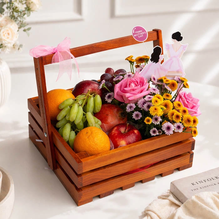 Celebrate Mom with a gift as beautiful and thoughtful as she is. This charming wooden crate is filled with a delightful assortment of fresh, juicy fruits including apples, oranges, grapes, pomegranate, perfectly paired with a vibrant arrangement of fresh flowers.