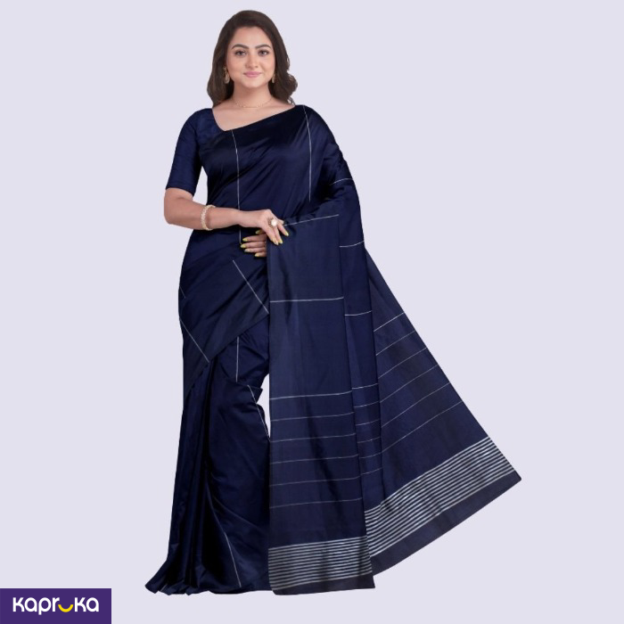 The Navy Blue Handloom Silk Saree is made from high-quality silk, crafted through traditional handloom techniques.