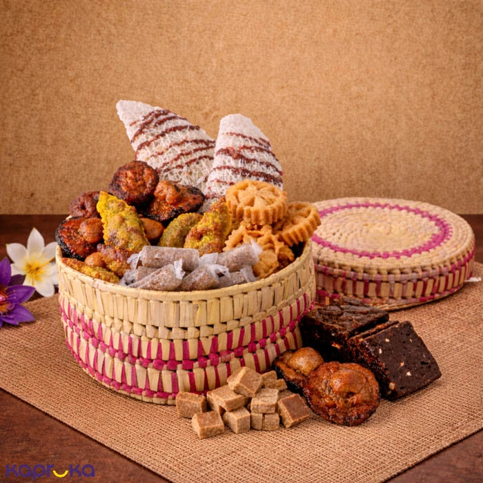The New Year Small Kewili Hamper includes a variety of traditional Sri Lankan sweet treats typically enjoyed during the New Year celebrations.