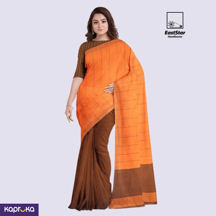 Experience elegance with the EastStar Handlooms Orange Brown Handloom Cotton Saree, available at Kapruka. This saree showcases a vibrant orange with delicate horizontal lines, enhanced by a dark brown border. The brown blouse features striking vertical stripes, offering a blend of sophistication and modern style. Perfect for any occasion, this saree brings a touch of glamour to your wardrobe.
