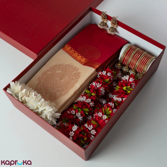 Make her birthday sparkle with the Radiant Diya Saree Gift Box, available at Kapruka in Sri Lanka. This beautifully arranged set is full of tradition and festive joy, perfect for a special lady. Inside the red gift box, you`ll discover: