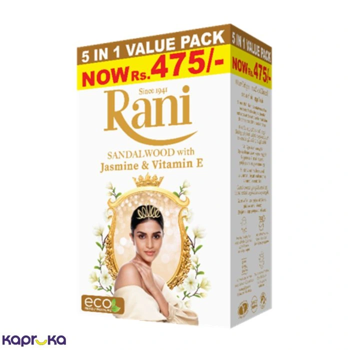 The main ingredients in Rani Jasmin and vitamin E Soap include jasmine essence and vitamin E, which are known for their skin nourishing properties.