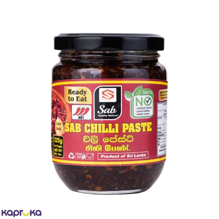 SAB Chilli Paste 225g is a rich and spicy condiment crafted from high-quality chillies blended with a perfect mix of traditional spices to deliver bold flavor and vibrant heat. Known for its deep red color, intense aroma, and well-balanced taste, this chilli paste enhances a wide variety of dishes including rice, noodles, sandwiches, and stir-fries. Whether used as a marinade, dip, or cooking ingredient, it adds a deliciously fiery kick to every meal. Hygienically prepared and carefully packed to maintain freshness and quality, SAB Chilli Paste is a must-have for those who enjoy authentic, spicy Sri Lankan flavors.