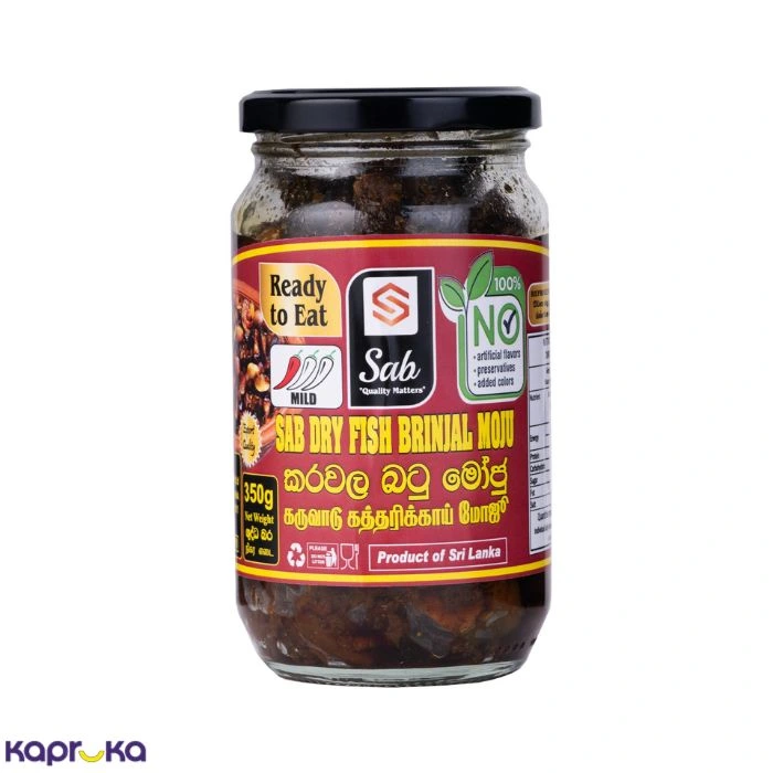 SAB Dry Fish Brinjal Moju 350g is a traditional Sri Lankan delicacy that perfectly combines tender brinjal with flavorful dry fish in a tangy, spicy, and slightly sweet moju blend. Expertly prepared with a balanced mix of aromatic spices, vinegar, and seasonings, this moju delivers bold flavors and a delightful aroma that enhances any meal. Ideal as a side dish or accompaniment to rice and curry, it brings authentic Sri Lankan taste to your table with every bite. Hygienically processed and carefully packed to preserve freshness and quality, SAB Dry Fish Brinjal Moju 350g offers a convenient way to enjoy a beloved local favorite at home.