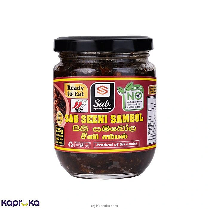 SAB Seeni Sambol 225g is a deliciously rich and traditional Sri Lankan relish made from slow-caramelized onions blended with chillies, spices, and a hint of sweetness to create a perfectly balanced flavor. Known for its deep brown color, aromatic fragrance, and sweet-spicy taste, this classic sambol pairs beautifully with bread, hoppers, string hoppers, rice, and roti. Whether enjoyed as a side dish or a spread, it adds a unique burst of authentic local flavor to every meal. Hygienically prepared and carefully packed to preserve freshness and quality, SAB Seeni Sambol offers a convenient way to enjoy a true Sri Lankan favorite anytime.