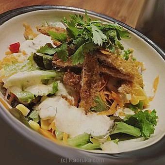 Golden chicken strips, Lettuce, Corn, Shredded Carrot, mix Peppers, Avocado, Tomato and onion Tossed In a santa FE Dressing With Herb Croutons.