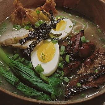Spicy shitake Mushroom chicken, Bok Choy, spring onion, fish Cake, Crispy Prawn dumpling and boiled Egg in A miso infused Broth.