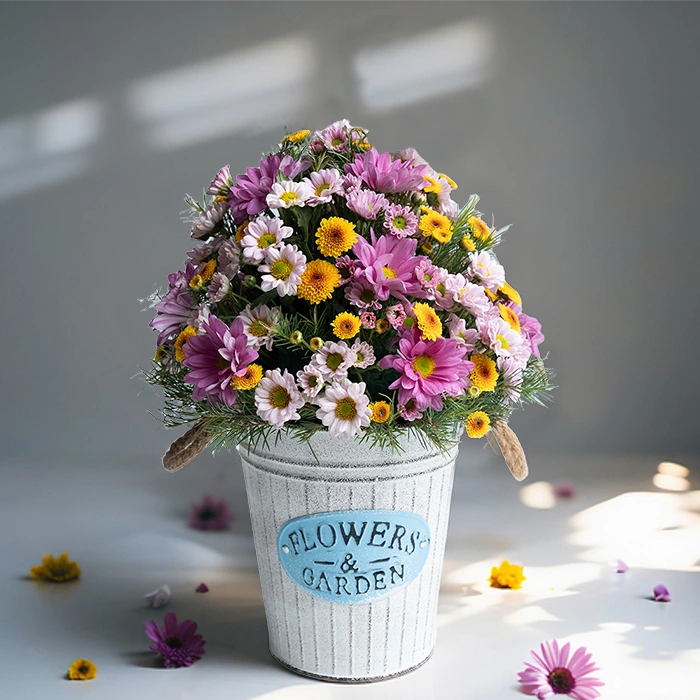 Brighten up any room with our Timeless Chrysanthemums Vase. This cheerful bouquet is perfect for making someone smile with vibrant golden button flowers and lovely pink and purple blooms. Arranged in a charming white garden pail with rope handles, itâ``s ideal as a gift or a centerpiece.