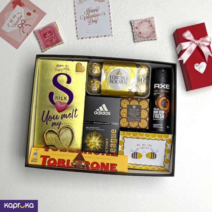 The `We Belong Together` gift box includes a variety of curated items aimed at celebrating a special occasion. The specific contents can be found in the product description on the webpage.