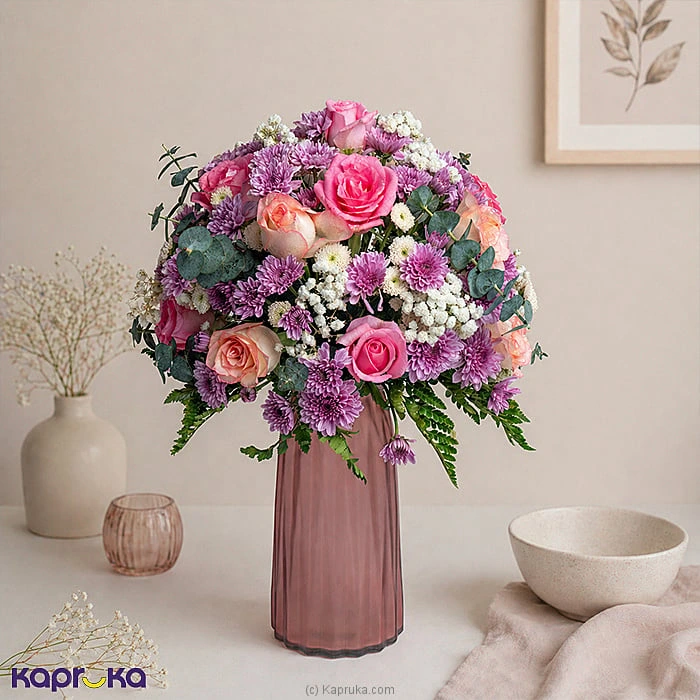 This graceful arrangement features a delicate mix of pink roses and pink white shaded roses, symbolizing love and appreciation, paired with white and purple chrysanthemums that add contrast, charm, and depth. Fresh eucalyptus foliage brings a modern, airy touch, while baby`s breath enhances the softness of the arrangement.