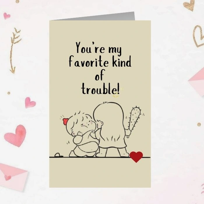 Celebrate love with this playful and mischievous Valentine`s Day card, perfect for that special someone who fills your life with joy and adventure. The charming message captures the essence of fun, love, and affection, making it ideal for a unique connection.