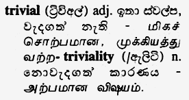 The significations in this dictionary is copyrighted and belongs to Kapruka.com and S. Godage Books. You are not allowed to download or re-use any images or meanings. This online dictionary may only be used for the purpose of reference and learning Sinhala and Tamil languages.