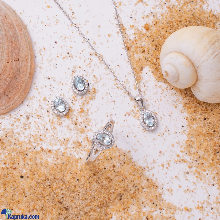 Jump into the Blue Ocean with me, Love! Four 6X4 Oval shaped Brazilian Aquamarine gemstones totaling 1.4Cts in total meticulously matched for perfect Ocean Blue colour and size surrounded by a single cluster of Cubic Zirconia and set in 925 Sterling Silver. This set sparkles with unrivaled beauty and elegance. Total weight of this set is 4.5Gms. Chain Excluded.