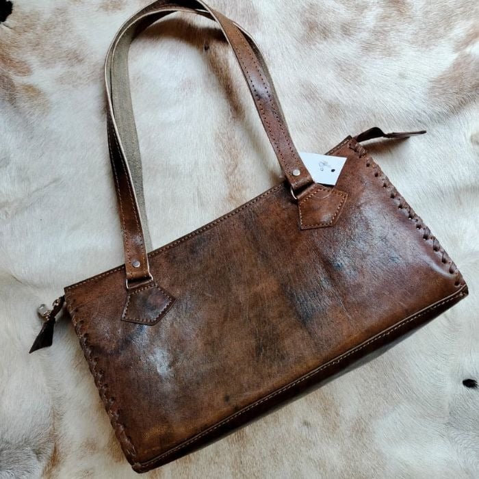 The bag is made from genuine goat leather, handcrafted to ensure quality and durability.